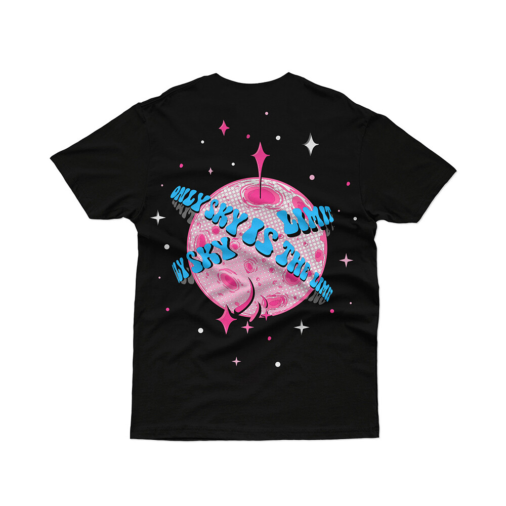 Tričko z limitované kolekce inspirované sny, odvahou a představivostí. Na první pohled jednoduché, ale s vesmírnou energií - nápis MOON na hrudi a růžový měsíc s mottem Only sky is the limit! na zádech. Modré detaily jsou vytištěny prémiovou technikou puff print, která dodává potisku jemný 3D efekt a originální vzhled.